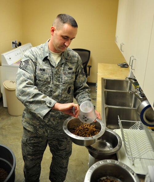 MINOT AIRFORCE BASE, N.D. - - Tech. Sgt. Randy Akin, 5th Security Forces Squadron military working dog kennel master, prepares morning chow for his canines, here April 24. Military working dogs are kept on a strict feeding schedule due to their rigorous training programs. (U.S. Air Force photo by Senior Airman Desiree W. Esposito)