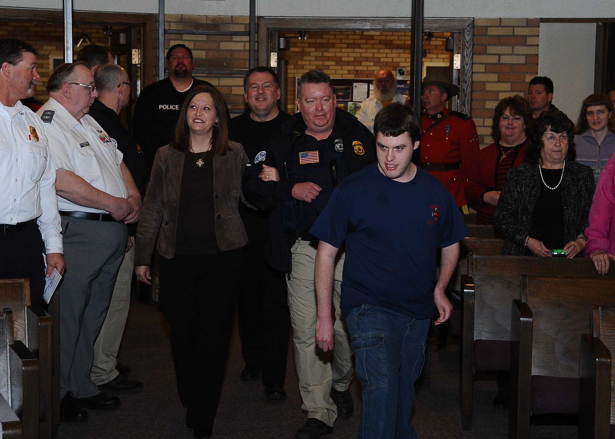 MINOT N.D. -- Marcus Anthony Cox was sworn in as an honorary special agent for his dedication and contributions to the law enforcement community at the First Assembly of God in Minot, Feb. 22. He was presented with a plaque, commemorating the event, by Mr. Peter Edge, Deputy Associate Director of Homeland Security Investigations. Ever since Cox was a young boy, he has always had the love and desire to be a part of the law enforcement community. Although faced with numerous medical challenges which he has overcome, he continues to volunteer his time to support Minot’s emergency services. Marcus’ plans for the future include staying connected to the emergency services and finding a way to actively be a part of helping to take care of people and to help keep them safe. (U.S. Air Force photo/Airman 1st Class Kristoffer Kaubisch)