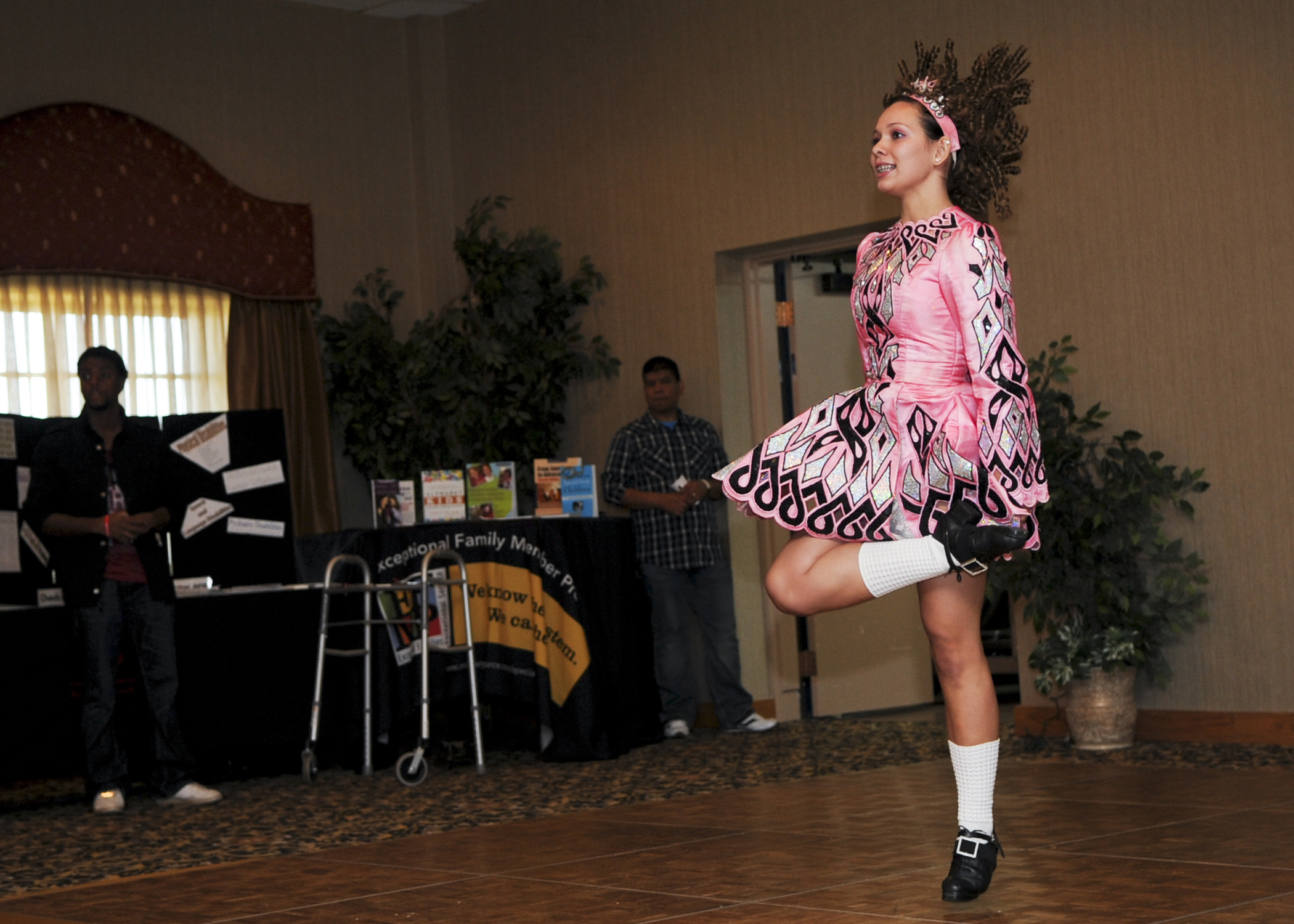 MINOT AIR FORCE BASE, N.D. – Olivia Molina, daughter of Senior Master Sgt. Joseph Molina, 5th Force Support Squadron flight superintendent, performs a traditional Irish dance at the Jimmy Doolittle Center Aug. 19. Molina was one of many Diversity Day performers. The event ran for approximately five hours and included a variety of multi-cultural booths, cooking, dancing, singing, and poetry. (U.S. Air Force photo/Senior Airman Ashley N. Avecilla) (RELEASED)