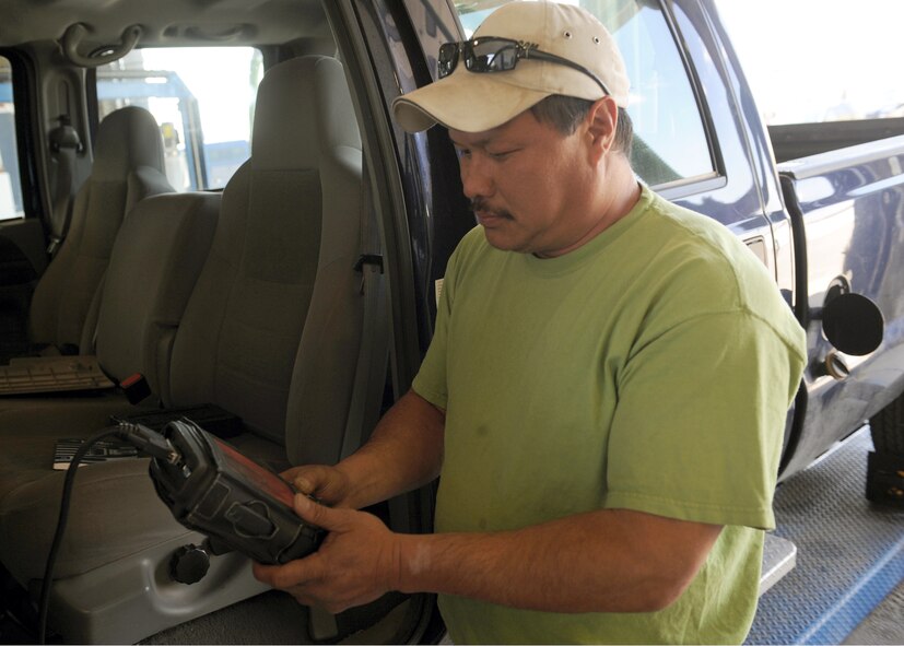 MINOT AIR FORCE BASE, N.D. -- Thomas Santos, 5th Logistics Readiness Squadron vehicle maintenance technician, checks the computer of a Ford pickup for trouble codes here April 27. These trouble codes tell the technician what is wrong with the vehicle or what needs to be replaced. (U.S. Air Force photo by Staff Sgt. Keith Ballard)