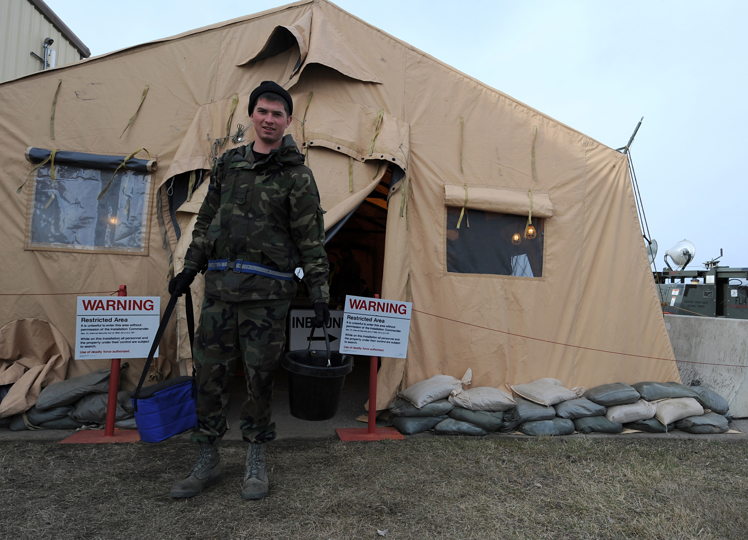 MINOT AIR FORCE BASE, N.D. -- Airman 1st Class Craig McNett, 5th Aircraft Maintenance Squadron crew chief, passes through an entry control point, April 24, after working a long day during Prairie Vigilance 09-7. Prairie Vigilance is a combined-wing exercise established to implement and assure safe, secure, reliable nuclear weapons standards and procedures. (U.S. Air Force photo by Senior Airman Kelly Timney)