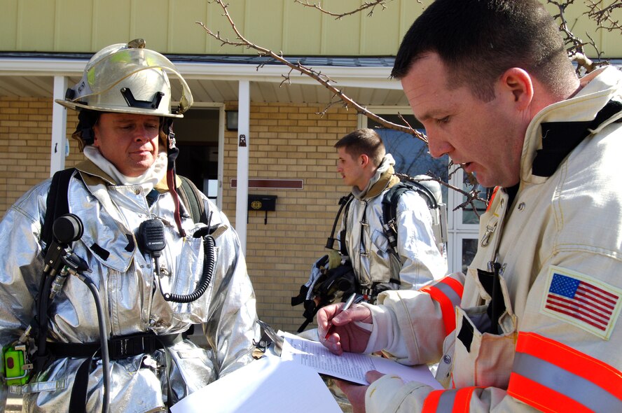 MINOT AIR FORCE BASE, N.D. -- (from left) The base deputy fire marshall, Chief Master Sgt. Robert Ward, looks on as Tech. Sgt. Kenneth Kline, assistant chief of operations at the base fire department, checks off safety procedures during a controlled house burn here March 17. (U.S. Air Force photo by Airman 1st Class Kelly Timney)