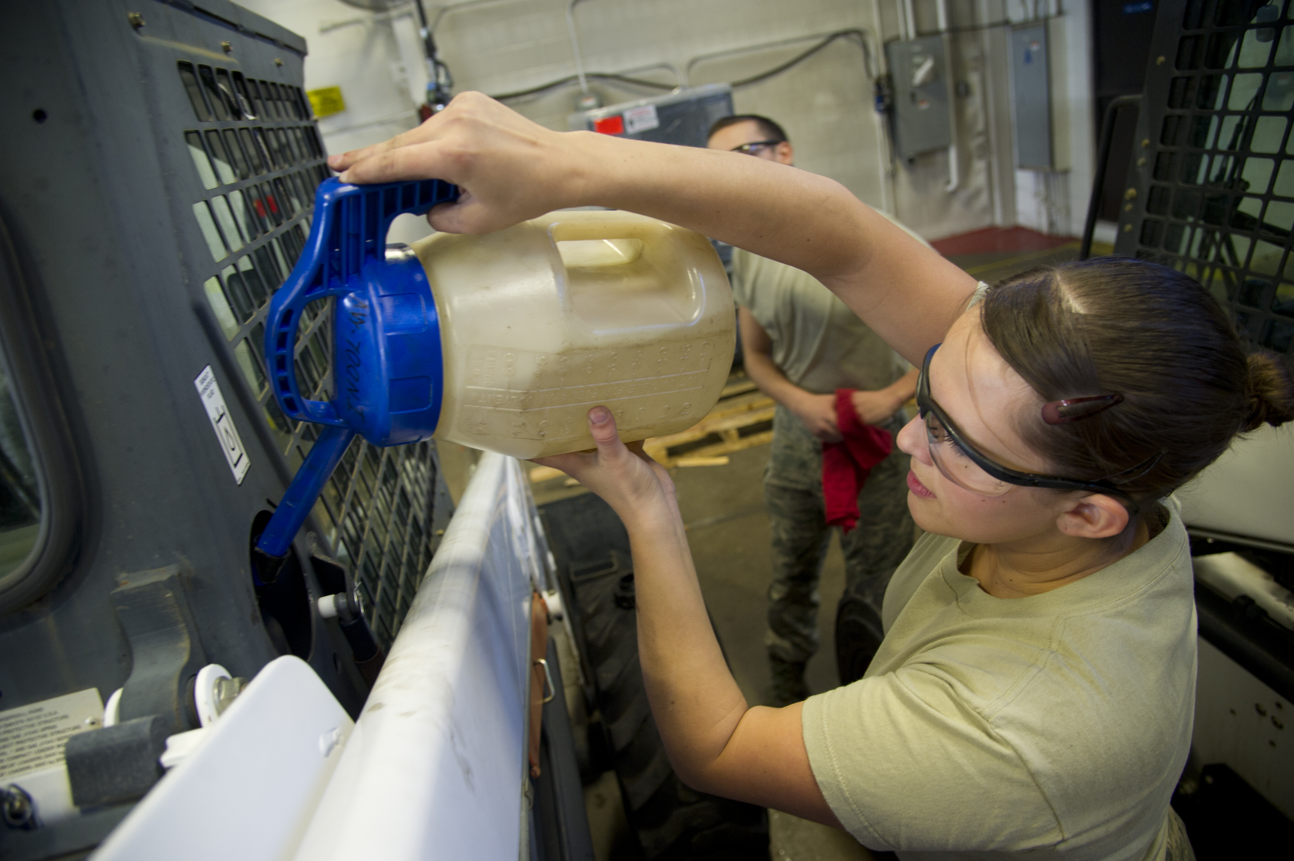 Airman 1st Class Johanna Desimone, 5th Logistics Readiness Squadron vehicle maintainer, pours fluid into a loader after checking the fluid level at Minot Air Force Base, N.D., Oct. 16, 2013. The 5th LRS vehicle maintenance flight repairs and maintains various types of vehicles to ensure Minot AFB stays mobile. (U.S. Air Force photo/Senior Airman Brittany Y. Auld)