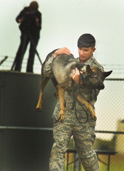 Staff Sgt. Christopher Averill, 5th Security Forces Squadron military working dog handler, carries 5-year-old German Sheppard Kety during the 2013 North Dakota Peace Officer Association K-9 Police Trials at Minot Air Force Base, N.D., Aug. 14, 2013. The competition brought police, military and security K-9 teams from around the state together in a friendly yet competitive environment. (U.S. Air Force photo/Senior Airman Brittany Y. Auld)