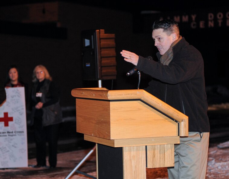 Col. Jason Armagost, 5th Bomb Wing commander, speaks during the holiday tree lighting event hosted at the Jimmy Doolittle Center on Minot Air Force Base, N.D. Dec. 6, 2014. Armagost called forward children attending the event to help him countdown to when the lights would be turned on. (U.S. Air Force photo/Senior Airman Stephanie Morris)