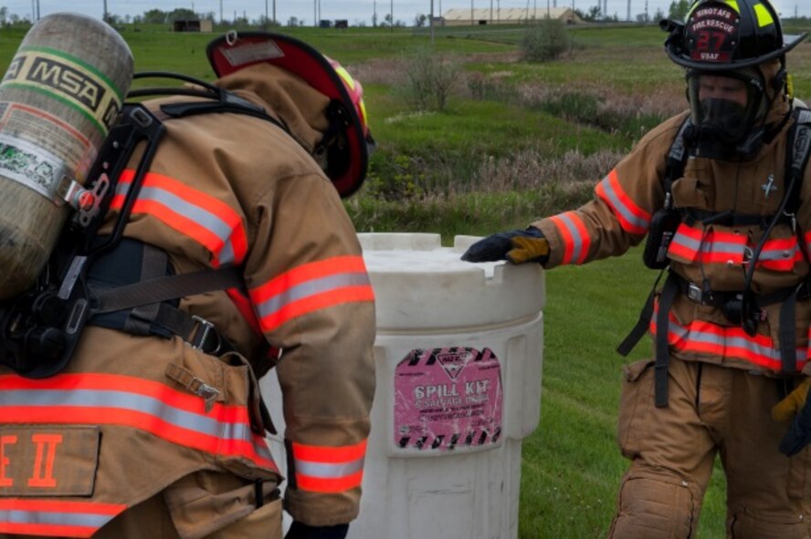 Members of the 5th Civil Engineer Squadron prepare to place a barrel leaking simulated hazardous material into another barrel to prevent any further harm during an exercise at Minot Air Force Base, N.D., May 29, 2015. The exercise tested the timeliness and efficiency of first responders in a simulated hazardous material situation. (U.S. Air Force photo/Airman 1st Class Christian Sullivan)