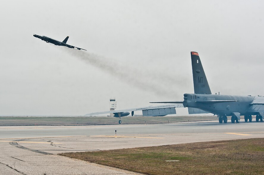 A B-52H Stratofortress assigned to Air Force Global Strike Command (AFGSC) takes off from the runway at Minot Air Force Base, N.D., Oct. 30, 2016, during exercise Global Thunder 17. AFGSC supports U.S. Strategic Command's (USSTRATCOM) global strike and nuclear deterrence missions by providing strategic assets, including bombers like the B-52 and B-2, to ensure a safe, secure, effective and ready deterrent force. Global Thunder is an annual training event that assesses command and control functionality in all USSTRATCOM mission areas and affords component commands a venue to evaluate their joint operational readiness. (U.S. Air Force photo by Airman 1st Class Jonathan McElderry)