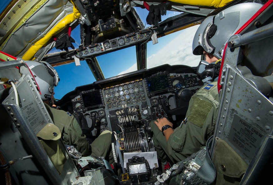 Capt. Franklin Baker, 5th Operations Support Squadron pilot and aircraft commander, observes his co-pilot during an in-flight turn near Minot Air Force Base, N.D., Aug. 2, 2017. The flight path was adjusted to avoid storms in the region. (U.S. Air Force photo by Senior Airman Apryl Hall)