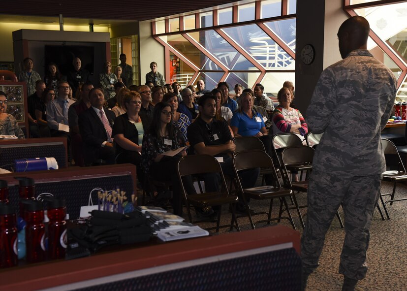 2nd Lt. Tyrone Williams, 5th Medical Support Squadron flight commander, briefs Minot healthcare providers during the 5th Medical Group’s Annual Partners in Health Open House at Minot Air Force Base, N.D., Aug. 18, 2017. During the brief, Williams explained the importance of maintaining good relations between the base and community. (U.S. Air Force photo by Airman 1st Class Alyssa M. Akers)