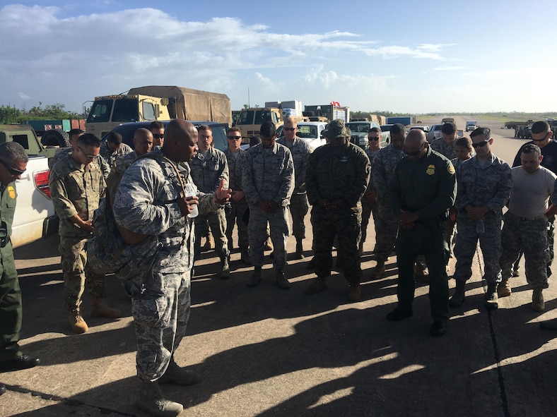 Capt. Paul Harris, 5th Bomb Wing chaplain, speaks to service members before a convoy mission during Hurricane Maria relief efforts in Aguadilla, Puerto Rico, October 23, 2017. Harris helped deliver about 8 million bottles of water and 5.5 million boxes of food to the people affected by the Hurricane. (Courtesy photo)