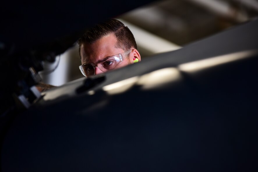 Staff Sgt. Jacob Whitlow, 5th Aircraft Maintenance Squadron load crew team chief, inspects an inert munition during a bomb loading competition at Minot Air Force Base, North Dakota, Sept. 7, 2018. Two weapons load crews, representing the 23rd and 69th Bomb Squadrons, were timed on their ability to efficiently load an inert munition onto a B-52H Stratofortress. (U.S. Air Force photo by Senior Airman Jonathan McElderry)