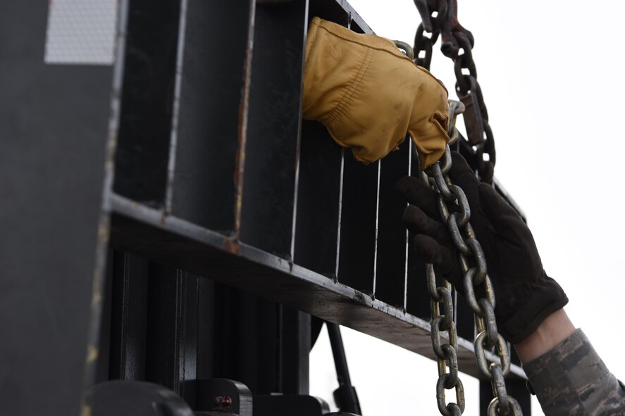 5th Logistics Readiness Squadron Airmen work together to fasten the arms of a forklift from moving at Minot Air Force Base, North Dakota, March 19, 2019. These Airmen work together as a team to accomplish the mission. (U.S. Air Force photo by Airman 1st Class Heather Leveille)