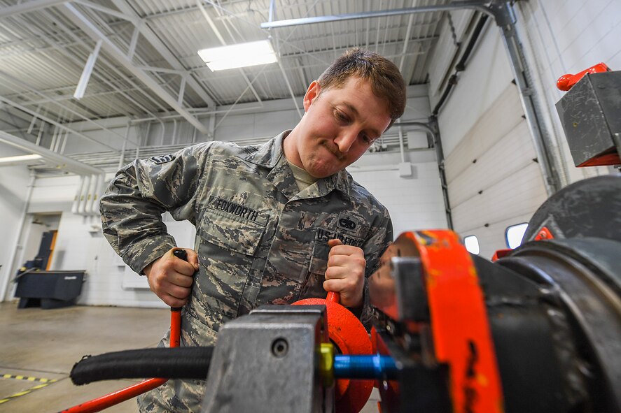 Staff Sgt. Stephen Foxworth, 5th Maintenance Squadron aircraft hydraulic systems craftsman, operates a hose assembly machine at Minot Air Force Base, North Dakota, April 4, 2019. It can take up to 30 minutes to create a proper hydraulic hose line from start to finish. (U.S. Air Force photo by Senior Airman Jonathan McElderry)