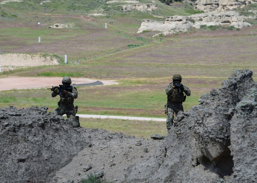 Senior Airman Ryan Mason II, 91st Security Support Squadron tactical response force member, and Senior Airman Kevin Freese, 341st Security Support Squadron TRF, navigate terrain during the advanced tactical course at Camp Guernsey, Wyo., June 19, 2019. The teams practiced infiltrating an enemy location and reacting to enemy fire. (U.S. Air Force photo by Staff Sgt. Ashley N. Sokolov)