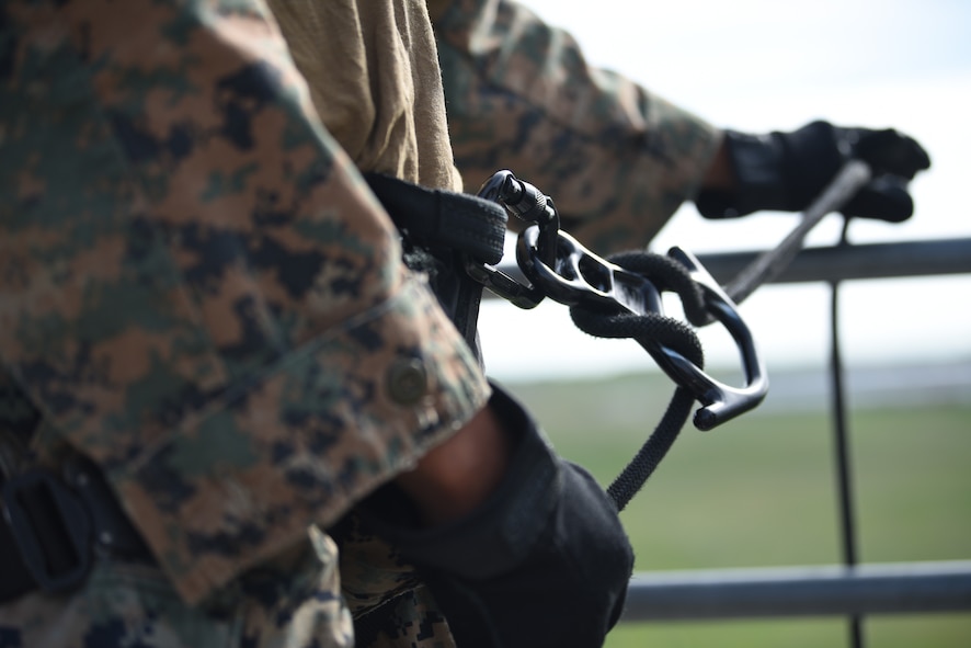 Marine Corps Sgt. Justin Roman, Marine Corps Security Forces Training Company instructor, sets up a figure 8 descender device during an advanced tactical course at the Cheyenne Fire Department training facility in Cheyenne, Wyo., June 17, 2019. The advanced tactical course teaches how to secure and recover missiles, warheads and other resources. (U.S. Air Force photo by Staff Sgt. Ashley N. Sokolov)