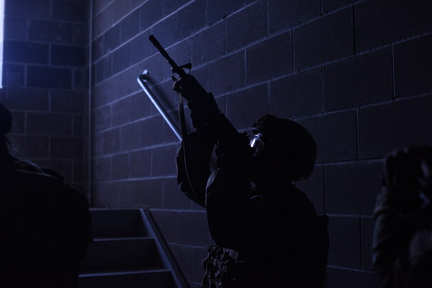 Staff Sgt. Enrique Salas, 31st Security Forces Squadron area supervisor, clears a stairwell during an advanced tactical course at the Cheyenne Fire Department training facility in Cheyenne, Wyo., June 17, 2019. Teams were taught how to move floor to floor and engage in enemy fire. (U.S. Air Force photo by Staff Sgt. Ashley N. Sokolov)