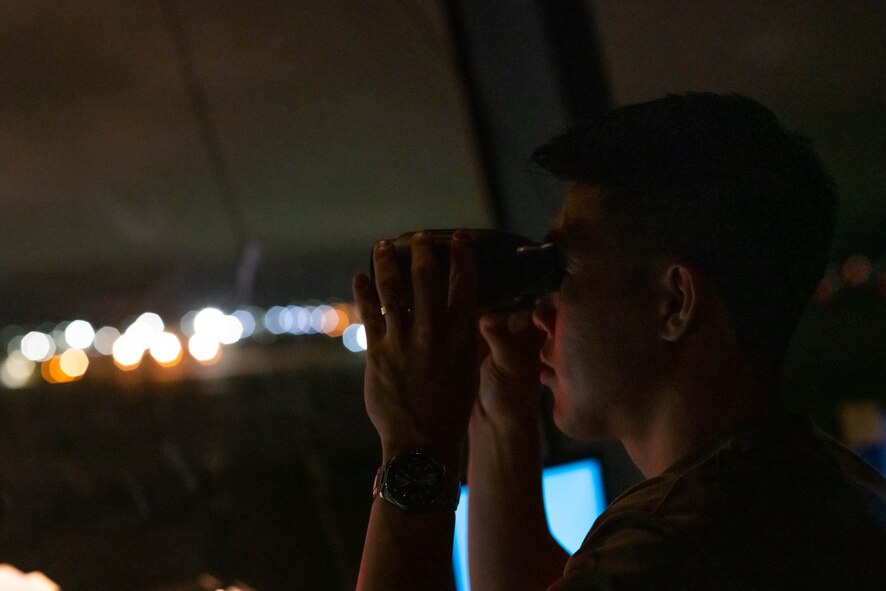 An Airman from the 5th Operations Support Squadron monitors flight line operations during exercise Prairie Vigilance at Minot Air Force Base, North Dakota, Sept. 17, 2022. Prairie Vigilance tests the 5th Bomb Wing’s ability to conduct strategic-bomber readiness operations. (U.S. Air Force photo by Airman 1st Class Alexander Nottingham)