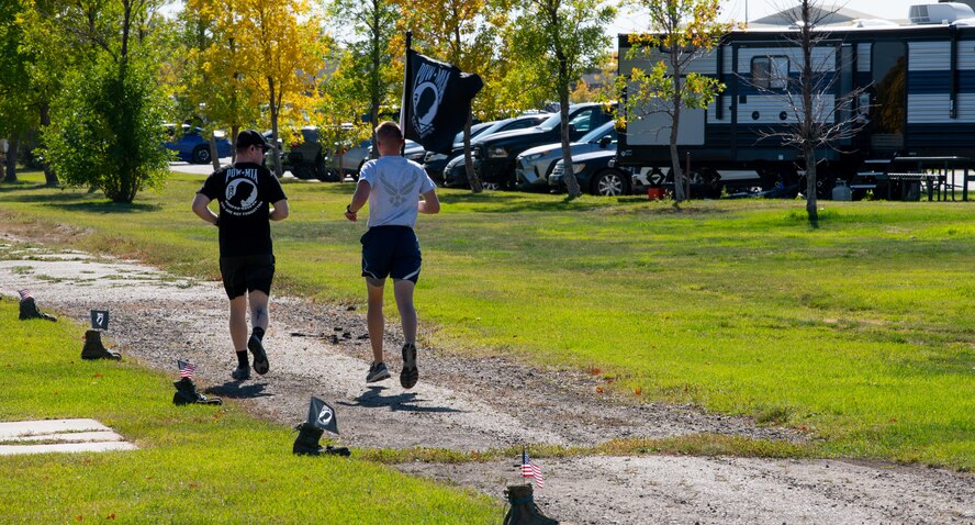Team Minot Airmen participate in a POW/MIA commemoration run, Minot Air Force Base, North Dakota, Sept. 29, 2022. Volunteers from the 5th Bomb Wing and the 91st Missile Wing ran for 24-hours with the POW/MIA Flag and the U.S. Flag in honor of those held in captivity and those who have yet to return home. (U.S. Air Force photo by Airman 1st Class Alexander Nottingham)