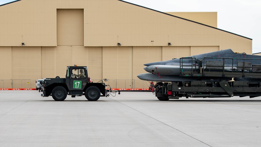 U.S. Airmen assigned to the 705th Munitions Squadron transport air-launched cruise missiles during Global Thunder 23 at Minot Air Force Base, North Dakota, April 12, 2023. U.S. Strategic Command holds the annual nuclear command and control exercise to test and validate the nuclear operation process to demonstrate the readiness of the nation’s nuclear capabilities. (U.S. Air Force photo by Senior Airman Zachary Wright)
