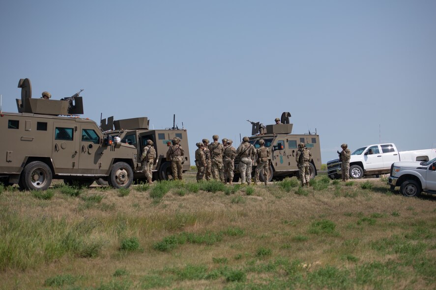 Airmen from the 91st Missile Security Forces Squadron, and the 219th Security Forces Squadron congregate after completing a convoy to a missile site at Minot Air Force Base, July 10, 2023. The convoy was a part of Operation Bullystick. Operation Bullystick was an event held to test agile combat employment concepts using a Minuteman III intercontinental ballistic missile.(U.S. Air Force photos by Airman 1st Class Trust Tate)