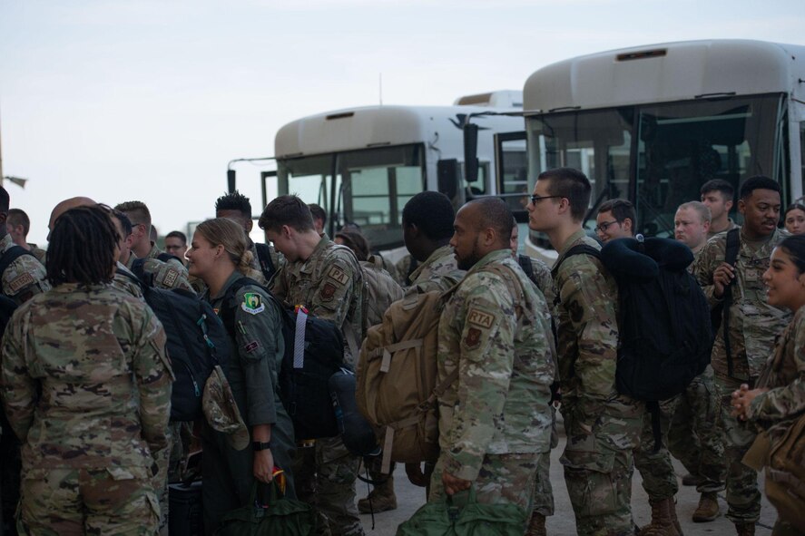 Airmen from the 5th Bomb Wing walk-off a bus after returning from a Bomber Task Force mission at Minot Air Force Base, North Dakota, July 24, 2023. The Airmen spent six weeks in Guam in support of Bomber Task Force missions. (U.S. Air Force photo by Airman 1st Class Trust Tate)