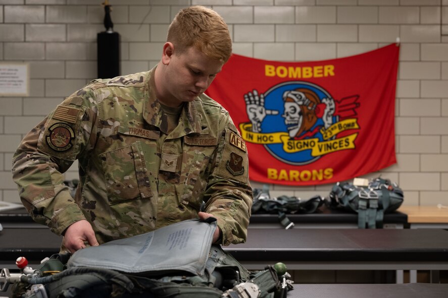 Senior Airman Hunter Thomas, 5th Operations Support Squadron aircrew flight equipment journeyman, assembles a pilot ejection harness during Prairie Vigilance 24-3 at Minot Air Force Base, North Dakota, April 8, 2024. Prairie Vigilance serves to ensure Allies and partners that the U.S. is ready to execute nuclear options and global strike anytime, anywhere, in order to deter and, if necessary, respond to strategic attack. (U.S. Air Force photo by Airman 1st Class Trust Tate)