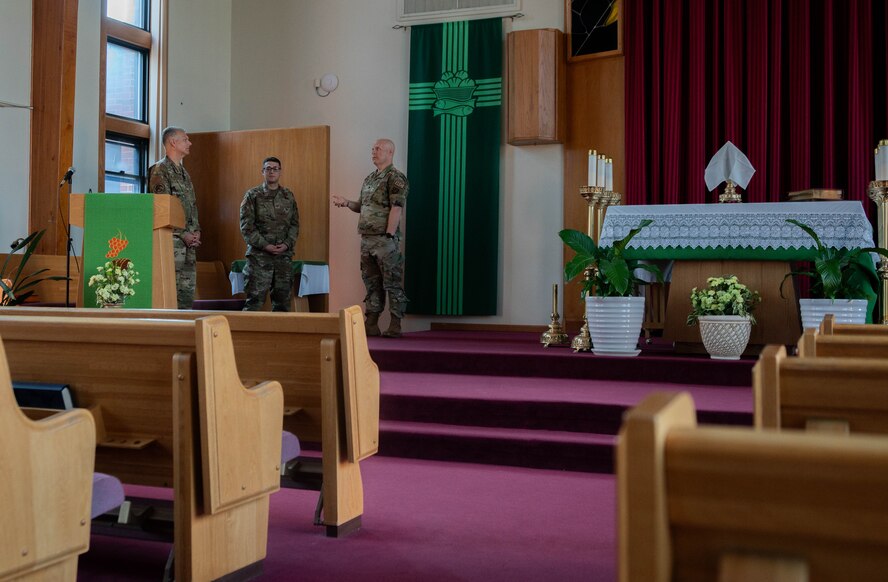 U.S. Air Force Col. Darren Duncan, U.S. Strategic Command command chaplain (left), is given a tour of the Northern Lights Chapel at Minot Air Force Base, North Dakota, July 30, 2024. Duncan is the principle advisor for one of 11 unified commands under the Department of Defense regarding the role of religion as it affects the operations across the competition continuum and to provide for the free exercise of religion for authorized personnel. (U.S. Air Force photo by Airman 1st Class Luis Gomez)
