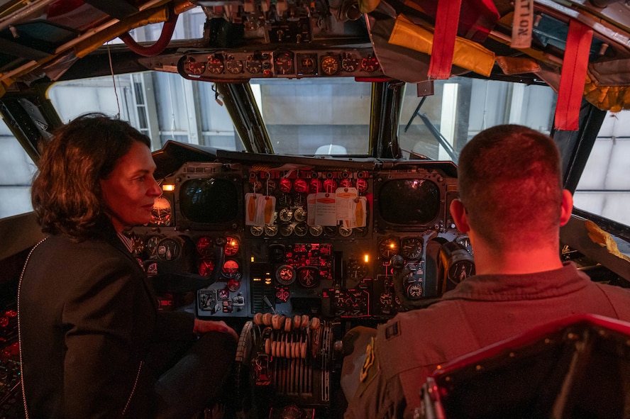 North Dakota Lt. Gov. Tammy Miller tours the cockpit of a B-52H Stratofortress at Minot Air Force Base, North Dakota, Aug. 15, 2024. Miller had the unique opportunity to learn the mission from B-52H crew members. (U.S. Air Force photo by Senior Airmen Alexander Nottingham)