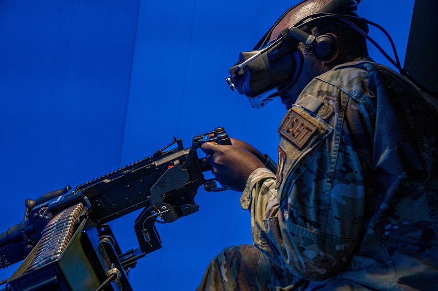 Master Sgt. Anthony Hackworth, Air Force Nuclear Weapons Center first sergeant, fires a M-240 weapon in a virtual UH-1 Iroquois simulation at Minot Air Force Base, North Dakota, Oct. 4, 2024. The virtual trainer allows Airmen to train on the M-240 more often and regularly, with no ammunition spent. (U.S. Air Force photo by Senior Airman Alexander)