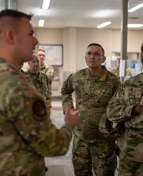 Chief Master Sgt. Travis Chadick, Air Force Nuclear Weapons Center command chief (center), listens during a briefing with Airmen from the 91st Maintenance Group at Minot Air Force Base, North Dakota, Oct. 4, 2024. The visit provided an opportunity for Chadick to discuss readiness and the vital role of maintenance personnel in supporting the nuclear deterrence mission. (U.S. Air Force photo by Airman 1st Class Luis Gomez)