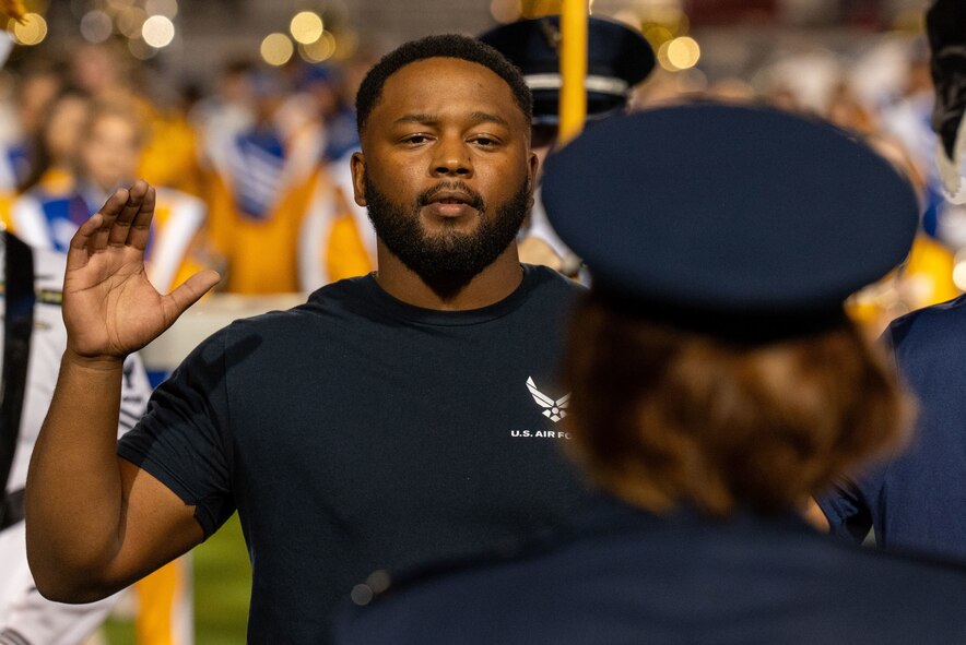 U.S. Air Force Delayed Entry Program recruit recites the oath of enlistment at halftime during the annual Angelo State University Military Appreciation game at the 1st Community Credit Union Field at LeGrand Stadium, San Angelo, Texas, Nov. 2, 2024. The oath of enlistment is a pledge to support the Constitution of the United States. (U.S. Air Force photo by Airman 1st Class James Salellas)