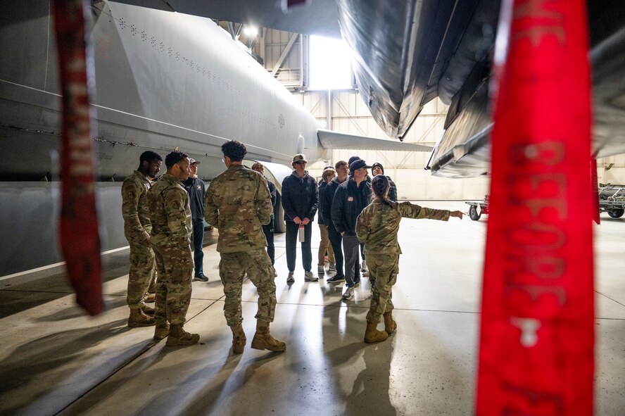 Airmen from the 5th Maintenance Group guide a tour about the outside of a B-52H Stratofortress to the Minot State University Track & Field Team at Minot Air Force Base, North Dakota, March 4, 2025. The tour group consisted of students from North Dakota, out of state and even international students. (U.S. Air Force photo by Senior Airman Kendra A. Ransum)