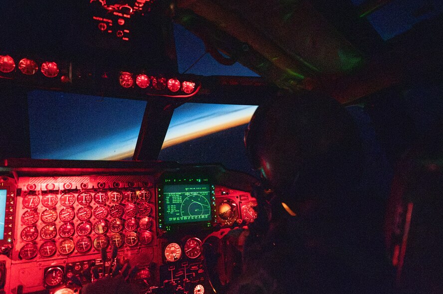 U.S. Air Force Lt. Col. Vincent Noel, 23rd Expeditionary Bomb Squadron commander, flies a B-52 Stratofortress aircraft during Bomber Task Force Europe over the North Atlantic Ocean, May 19, 2025. BTF missions demonstrate the credibility of our forces to address a global security environment. (U.S. Air Force photo by Staff Sgt. Bryan Guthrie)