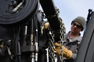 5th Logistics Readiness Squadron Airmen tow a forklift at Minot Air Force Base, North Dakota, March 19, 2019. Many Air Force operations rely on ground vehicles to complete their mission. (U.S. Air Force photos by Airman 1st Class Heather Leveille)