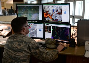 Airman Connor McDonald, 5th Operations Support Squadron weather forecaster, monitors the weather conditions via satellite at Minot Air Force Base, N.D., April 18, 2017. The 5th OSS weather forecasters create and tailor data to flying and ground assets. (U.S. Air Force photos/Airman 1st Class Dillon