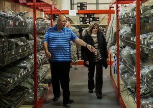 Ms. Kristin K. French, Principal Deputy to the Assistant Secretary of Defense for Logistics and Materiel Readiness, visits the base supply center at Minot Air Force Base, N.D., Feb. 7, 2017. French’s tour of the BSC highlighted cold weather gear stock and issuing procedures. (U.S. Air Force photo by