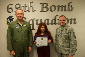 Ermelinda Torres, 69th Bomb Squadron command support staff, receives the 5th Bomb Wing "Own It" Award at Minot Air Force Base, N.D., Aug. 5, 2016. Torres overhauled squadron in-processing procedures, allowing new members to expeditiously start Mission Qualification Training. She processed more than