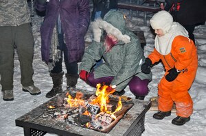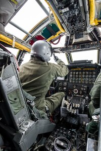 Aircrew from the 69th Bomb Squadron go through a pre-flight checklist inside the cockpit of a B-52H Stratofortress while members of the 5th Civil Engineer Squadron remove snow from the flightline before a training sortie at Minot Air Force Base, N.D., Jan. 14, 2016. Bomber Airmen work around the