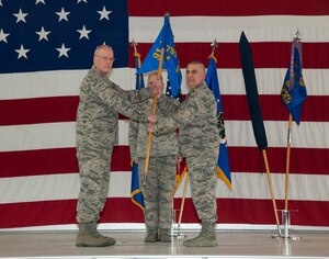 Col. Earl Bennett, 91st Maintenance Group commander, hands the new 791st Maintenance Squadron guidon to Major Louis Rognoni, 791st MXS commander, at Minot Air Force Base, N.D., Jan. 4, 2015. During the ceremony the 91st Maintenance Operations Squadron was deactivated and the 791st MXS was activated.