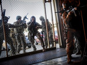 "DEPLOY! DEPLOY! DEPLOY!" The team shouts as they race out of the vehicles and approach a chain link fence. Sparks fly as they begin to strike the barrier with a K12 saw to create a pathway. With 360 degree security set up, the team moves with swift and precise action into the rooms, not knowing