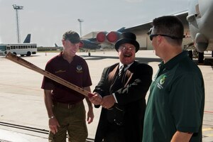 Joe Weigand, a Teddy Roosevelt impersonator, relishes his bully stick with Col. Jason Armagost (right), 5th Bomb Wing commander, and Col. Michael Lutton (left), 91st Missile Wing commander, at Minot Air Force Base, N.D., Aug. 15, 2015. Weigand performed before the Lt. Dan Band where he talked about