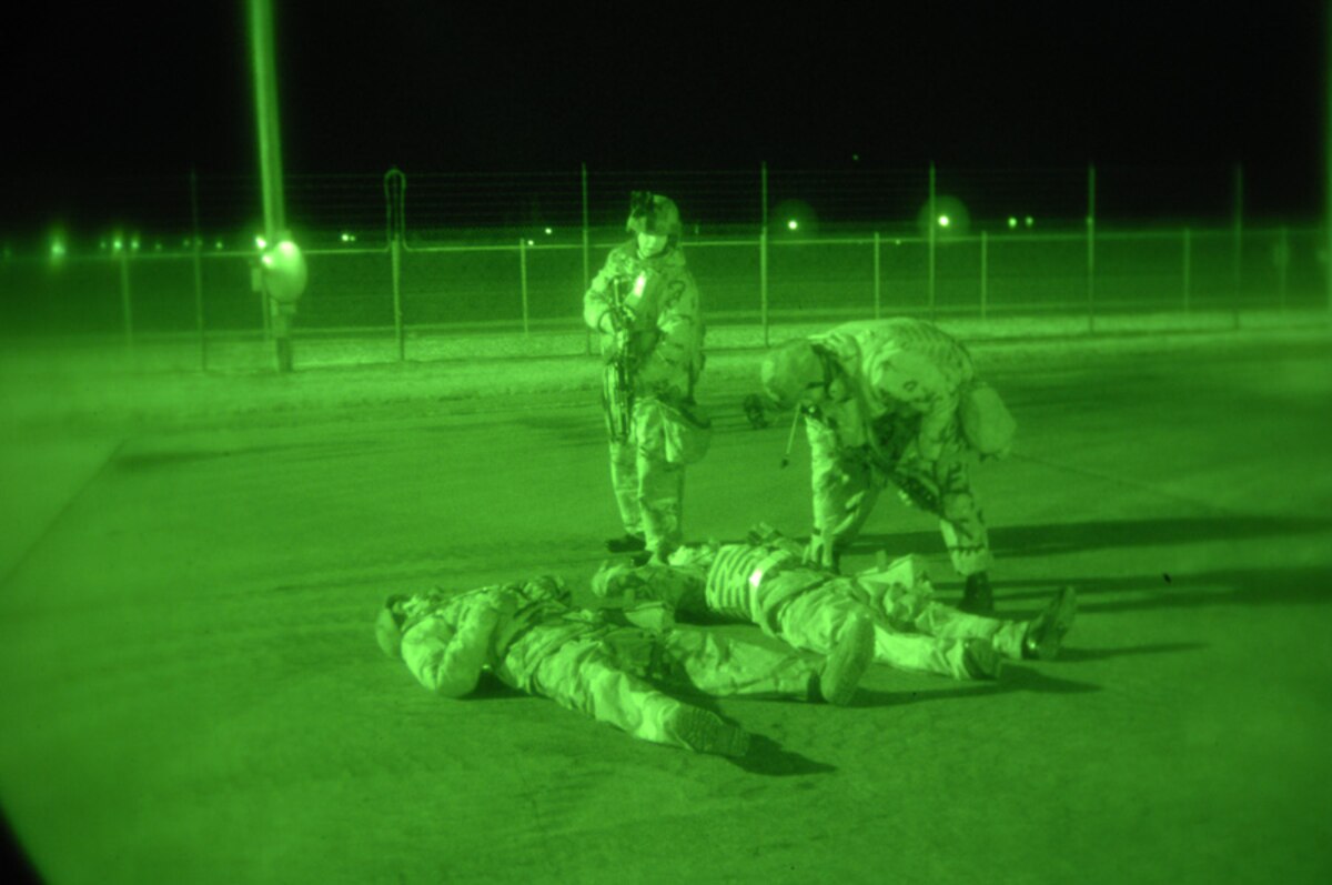 MINOT AIR FORCE BASE, N.D. -- Airmen from the 5th Security Forces Squadron check the "dead" bodies of the opposing forces killed in a simulated fire fight during a base exercise, here, Nov. 8. Bodies are checked to ensure there are no hidden explosive devices. (Photo by Airman 1st Class Cassandra Jones)
