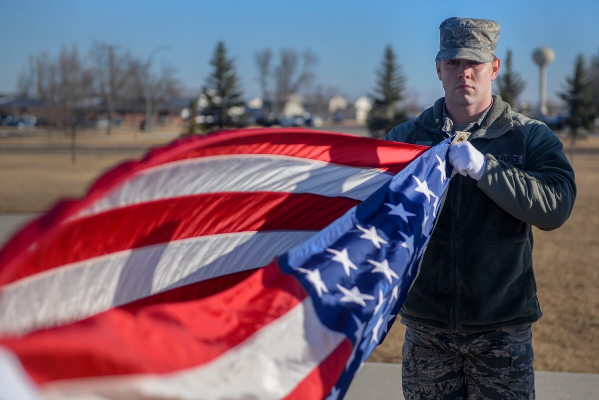 Guard your honor Published March 28, 2016 By Airman 1st Class Jessica Weissman Minot Air Force Base Public Affairs MINOT AIR FORCE BASE, N.D. -- At a windy Thursday morning practice, three Airmen from Minot Air Force Base Honor Guard stand at parade rest waiting for a command of execution. On the given cues, the Airmen snap to attention, march forward and perform a left wheel turn towards the flag pole. In step, the Airmen climb the three steps to the base of the flag pole and wait for their next order from the commander of troops. The Honor Guard has the core mission of performing military funeral honors for veterans and retirees of the Air Force. "Whether you serve two years, four years or 40 years, and you want to be buried here in North Dakota, we're going to provide military funeral honors for you," said Tech. Sgt. Joshua Hull, Minot AFB Honor Guard program manager, who added that they perform 40-60 funerals per year, reaching across 80 percent of North Dakota. During a military funeral, the ensign is folded using the traditional 13-fold method and given to the next of kin for the dedication and service of their family member. "Flag folding is my favorite part of Honor Guard," said Airman 1st Class Alessio Johnson, a cyber surety journeyman assigned to the 5th Communications Squadron. "The flag represents the person that has passed away, so it is important for us to make it look the best we can." As secondary missions, the Honor Guard presents the colors at various events on base and throughout the community. Including, Change of command ceremonies, retirement home visits and several Minot State University events as just a few of the details Honor Guard does. "We attend the North Dakota State Fair every year," said Hull. "There are 280 entries, I mean, it's the biggest thing in North Dakota and our Honor Guard, well we're at the front. It's really neat to be the first position, but also to see that everyone is sitting down, old, young, people of all different ages, but when you're marching by they start to stand up. At that time, all you can hear is the clicking of the shoes of the Honor Guard and the weapons manuals, but in those moments of silence, you can hear parents and grandparents tell their children or grandchildren, 'you have to place your hand over your heart'. Also, you can hear people recite the pledge of allegiance, or sing the national anthem and they start to clap. That is a very memorable job, and the impact we have on the community is what I'll most take away from those experiences." Minot Air Force Base Honor Guard is an all-volunteer unit, as they are not required to meet a quota for certain Airmen. "The Airmen are here because they want to be here," said Hull. "They know the impact and they want to better themselves. They know it is a mission where they get to do something bigger than themselves." For their service in the Honor Guard, Airmen receive free monthly haircuts from the base barber shop, free ceremonial uniforms, free bowling and free pizza from Rough Riders. Hull also said that as members of base Honor Guard, Airmen uphold the core values, build a strong network between career fields and gain a deeper respect for military tradition. "An Airman from the maintenance squadron could come here and leave being best friends with a food service specialist from the dining facility," said Hull. The three Airmen prepare to lower the flag as the commander of troops yells "sound retreat". As they wait at parade rest, the Airmen are ordered to attention when the music would begin to play. As the flag is lowered by two Airmen, the NCO in charge executes present arms for the duration of the song. As the flag nears the ground, the NCO in charge performs order arms and secures the flag before it touches the ground. Once controlled, the flag is unhooked from the halyard and the two Airmen center themselves in preparation for a two-man flag fold. The Airmen fold the flag, march to the commander of troops and stop to present the flag. The NCO in charge declares the flag has been secured and the detail is finished.