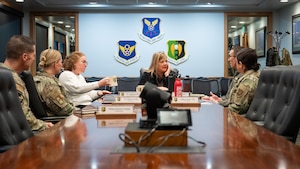 Mark Jantzer (center), mayor of Minot, poses for a photo with U.S. Air Force Col. Jesse W. Lamarand (right), 5th Bomb Wing commander, and U.S. Air Force Col. Jimmy Schlabach (left), 91st Missile Wing commander, at Minot, North Dakota, April 6, 2026. Jantzer and Team Minot leadership signed a